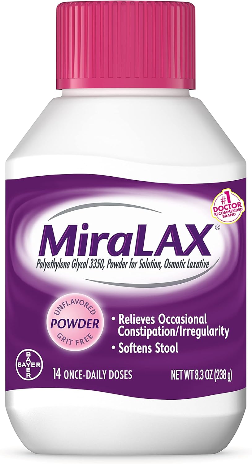 MiraLAX is the #1 doctor recommended laxative for occasional use, providing effective, predictable and gentle constipation relief. As an osmotic laxative, MiraLAX powder works naturally with the water in your body to hydrate, ease and soften stool. Unlike stimulant laxatives for constipation, which make your body go by forcefully stimulating the nerves in your colon, MiraLAX’s only ingredient, polyethylene glycol 3350, provides a gentle experience that doesn’t cause harsh side effects, such as sudden urgency, cramping, bloating and gas. MiraLAX powder laxative easily mixes into any beverage and completely dissolves, leaving no added taste or grit.