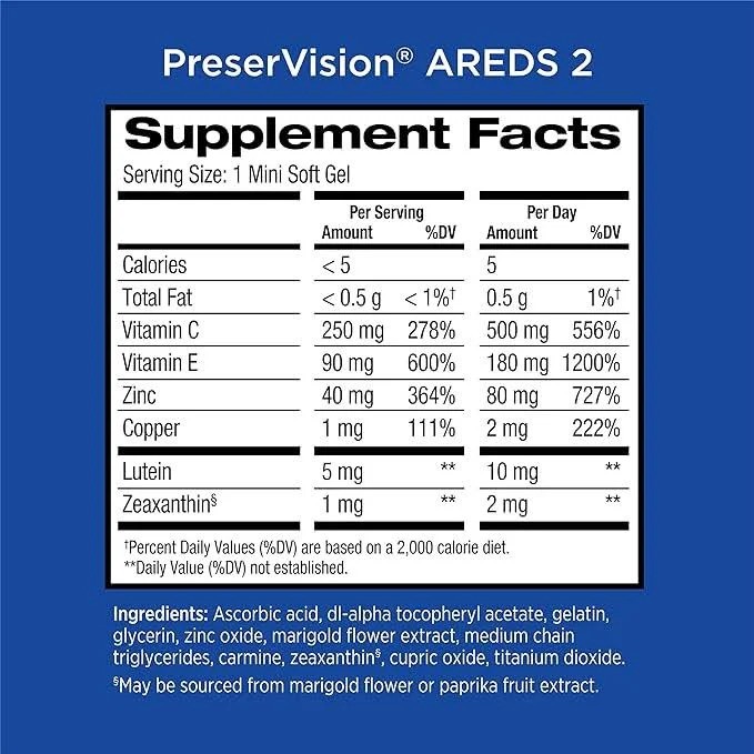PreserVision AREDS 2 Formula Eye Vitamin and Mineral Supplement, from the eye care experts at Bausch + Lomb, contains the exact levels of six nutrients recommended by the National Eye Institute to help reduce the risk of progression in people with moderate to advanced Age-related Macular Degeneration (AMD)*. The 6 nutrients found in these eye health vitamins include lutein, zeaxanthin, vitamin E, vitamin C, zinc, and copper. Preservision is the most studied eye vitamin brand (based on the AREDS and AREDS2 clinical studies). PreserVisionAREDS 2 Formula Eye Vitamin and Mineral Supplement soft gels are eye supplements that build on the original, clinically proven PreserVision AREDS formula, with lutein and zeaxanthin replacing beta-carotene based on the National Eye Institute’s Age-Related Eye Disease Study 2 (AREDS2). Ask your doctor if PreserVision AREDS2 Formula is right for you. Soft Gels with 6 Essential Nutrients Recommended by the National Eye Institute, AREDS 2 Formula with Lutein and Zeaxanthin Replacing Beta-Carotene