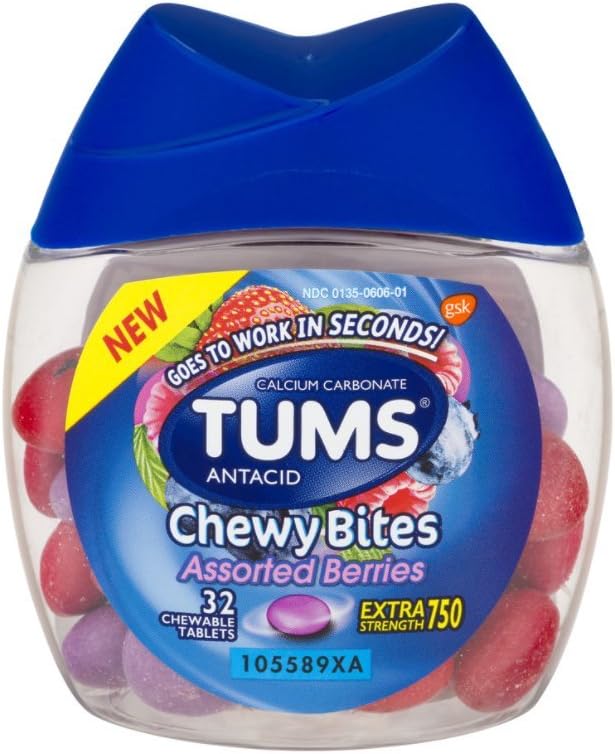 TUMS Chewy Bites Chewable Antacid Tablets go to work in seconds to make heartburn relief simple and delicious. When symptoms occur, take two to four chewable antacids, depending on the severity of your acid indigestion. Featuring the active ingredient calcium carbonate, these chewy antacids relieve heartburn, sour stomach, acid indigestion and provide upset stomach relief associated with these symptoms. Each chewable tablet delivers fast relief in every bite. With a delicious outer shell and soft center, these TUMS Chewy Bites come in three delicious assorted berry flavors. TUMS antacid tablets are the #1 recommended adult antacid brand by doctors, pharmacists and OBGYNs. As America’s #1 antacid and trusted as a heartburn medicine for 90 years, TUMS is fully supported with a satisfaction guarantee.